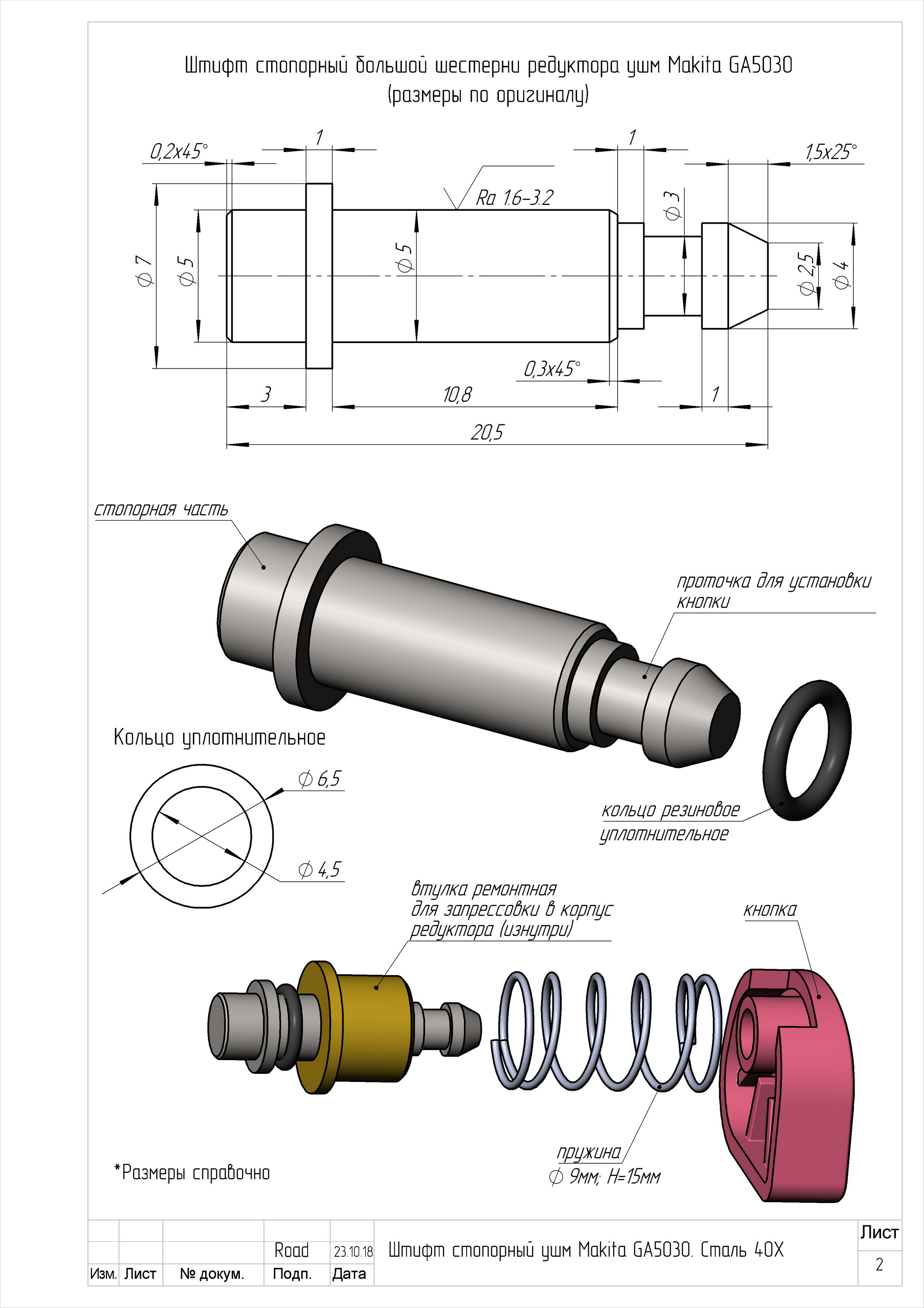 Чертеж стопорного штифта (стопора) большой шестерни редуктора УШМ ("болгарки") MAKITA GA5030