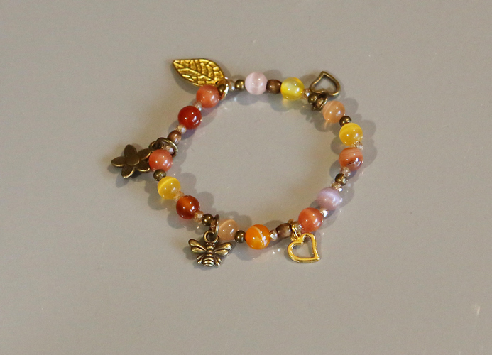 7,00 EUR - Bitīte Maija --- bērnu aprocīte --Vasarīgi saulaina aprocīte ar piekariņiem ---- Materiāls: ahāta pērlītes 6mm; "kaķa acs"stikla pērlītes 6mm; piekariņi bronzas un zelta krāsā; dubulta silikona gumija